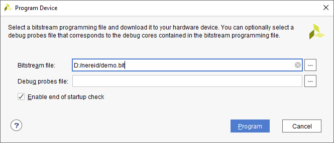 Step 4: In the dialog window which opens up, Vivado automatically chooses the correct bitstream file if the design was synthesized, implemented and bitstream generated successfully. If needed, browse to the bitstream which needs to be programmed to FPGA. Finally click “Program”.