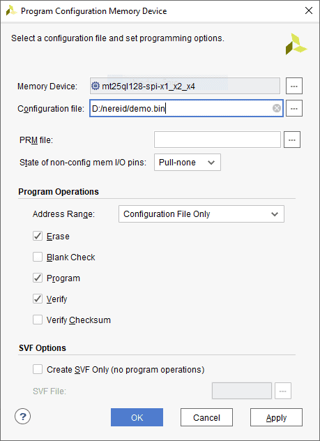 A .bin or .mcs file is required for programming Nereid’s onboard QSPI flash.