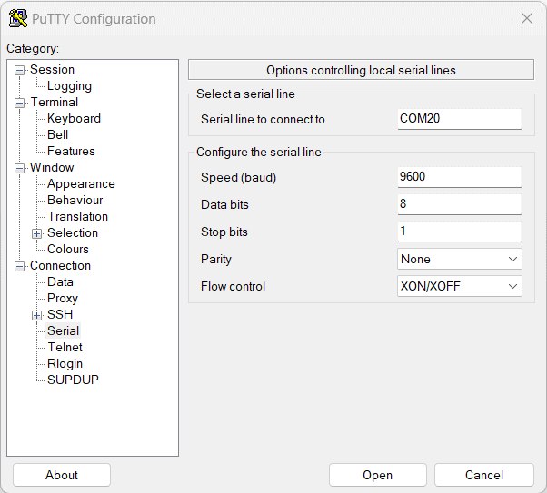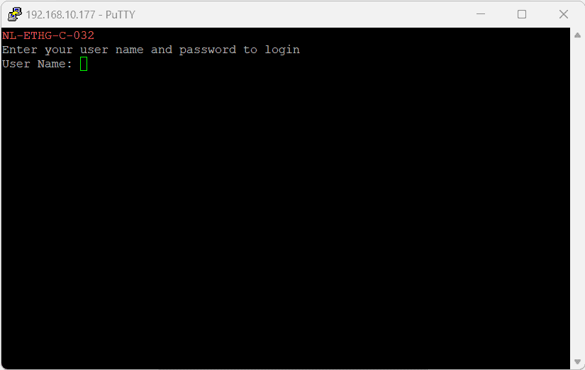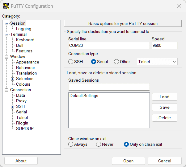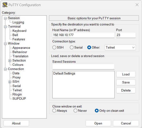 - Open PuTTY and enter the IP address corresponding to the module, leaving the port number as 23.