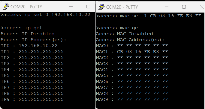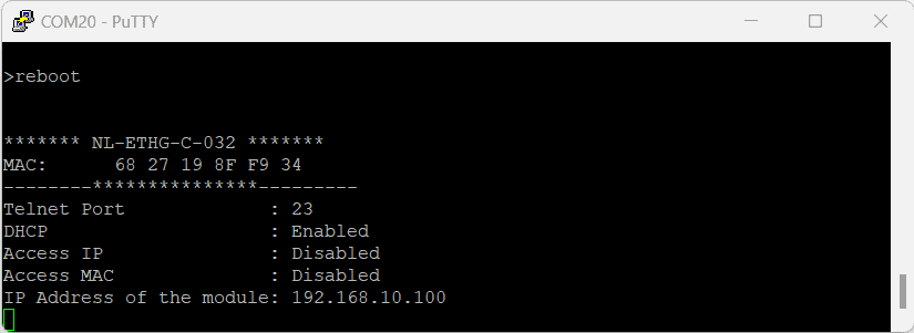 The simple set of ASCII based human readable command sets supported by this module makes controlling relays easy via TELNET protocol very easy. The following sections give examples of how to use the module with PuTTY and TeraTerm.