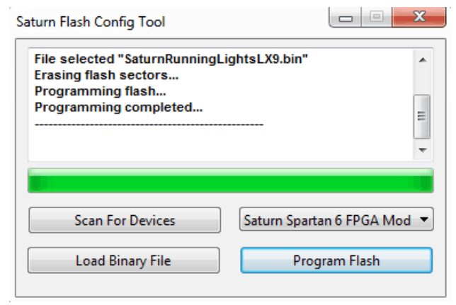 Saturn has an onboard FTDI FT2232 device which facilitates easy reprogramming of onboard SPI flash through the USB interface. The FTDI receives bitstream from the host application and program it into the SPI Flash and lets the FPGA boot from the flash. The Saturn configuration application can be downloaded from www.numato.com for free.