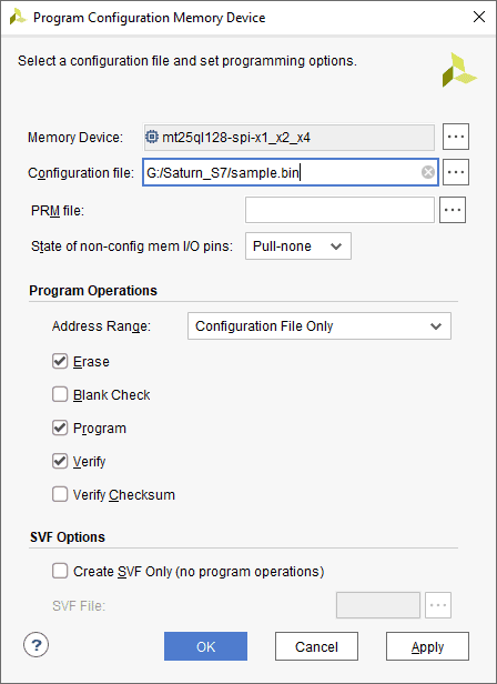 A .bin or .mcs file is required for programming Saturn’s onboard QSPI flash.