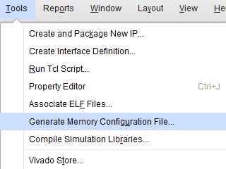 Step 1: Open Xilinx Vivado Hardware Manager. Connect the board, click “Generate Memory Configuration File….” from the “Tools” menu. “Write Memory Configuration File” pop up window will open.