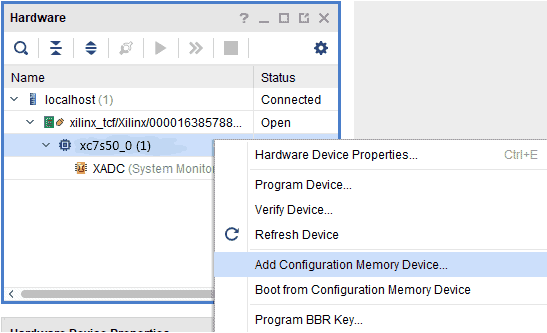 Step 2: If the device is detected successfully, then select “Add Configuration Memory Device” after right-clicking on the target device “xc7s50_0” as shown below.