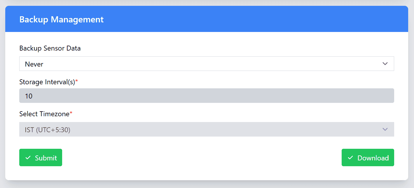 - Backup Interval: Set how often the device should back up sensor data. You can choose the interval that best suits your needs (e.g., every 10 minutes, hourly, or daily). The interval determines how frequently the device logs and saves the data to the local storage.