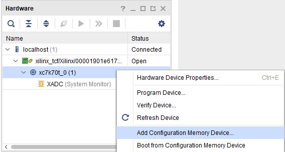 Step 2: If the device is successfully detected, then right-click on the “xc7k70t_0 (1)”. Select “Add Configuration Memory Device” as shown below.