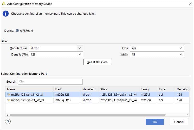 Step 3: Select the memory device “mt25ql128-spi-x1_x2_x4 (which is equivalent to n25q128-3.3v-spi-x1_x2_x4)”, then click OK.