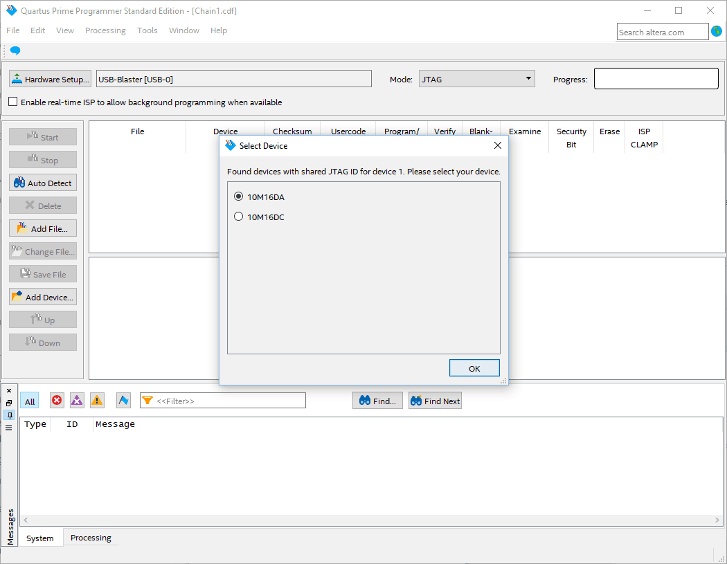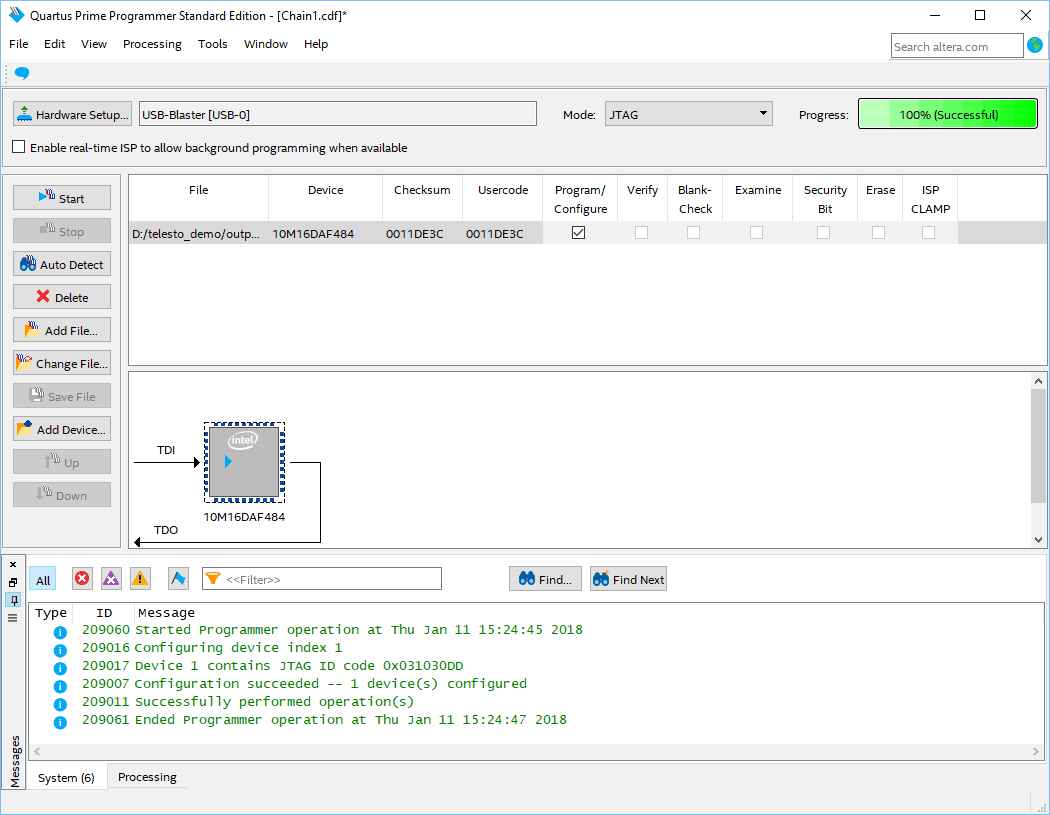Telesto Max 10 FPGA Module features a JTAG connector which facilitates easy reprogramming of SRAM and internal flash through external JTAG programmer like “USB-Blaster II”. Programming Telesto using USB-Blaster requires “Quartus Programmer”. To program the FPGA SRAM, an “.sof” (SRAM object file) file is required and to program internal flash, a “.pof” (Programmer object file) file is required. In Quartus, the .sof and .pof files are generated automatically as part of compilation process. Please follow the steps below to program Telesto using USB-Blaster.