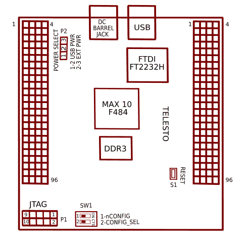 Telesto is an easy to use FPGA Module featuring Intel (formerly Altera) MAX 10 FPGA. The MAX 10 FPGAs come with dual embedded NOR Flash, with almost instant-on functionality hence eliminating the need for external configuration memory. The dual configuration flash on MAX 10 allows users to store and dynamically switch between two bitstreams on a single chip. They also feature integrated Analog-to-Digital Converters (ADCs). Telesto is pin compatible with Saturn Spartan 6 FPGA Module, Neso Artix 7 FPGA Module , Skoll Kintex 7 FPGA Module as well as Styx Zynq FPGA Module and offers a seamless upgrade path. The high speed USB 2.0 provides fast and easy configuration download to the built-in flash via JTAG using OpenOCD. No programmer or special downloader cable is needed to download the bitstream to the board. Telesto provides users with flexibility in adding their own peripherals through IOs available on its headers.