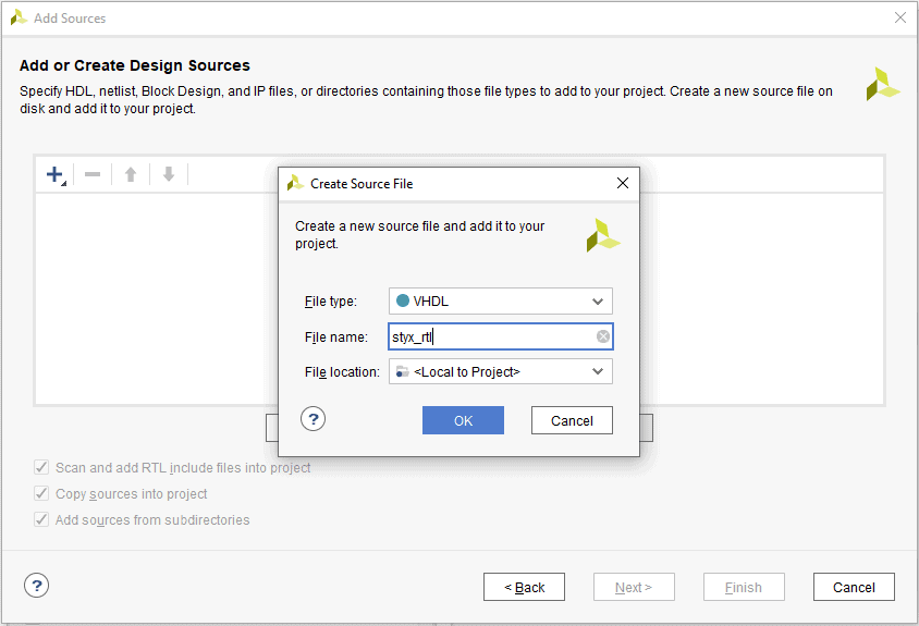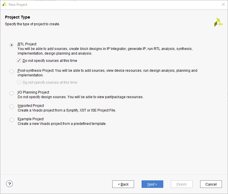 In the Project Type window, select RTL Project and check the “Do not specify sources at this time” option. Click Next.