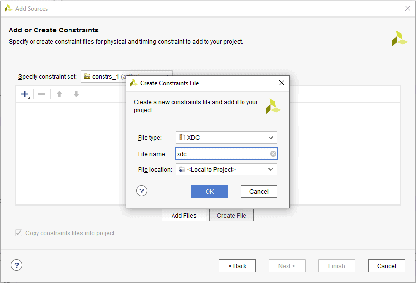 Click on Create file and give a name for the XDC and select “File type” as XDC. Click OK and then Finish.