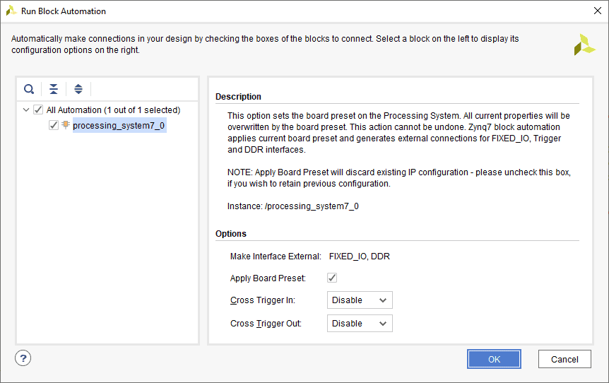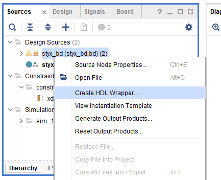 In the Sources window, right-click on the design and select Create HDL Wrapper. Click OK in the dialog box that appears.