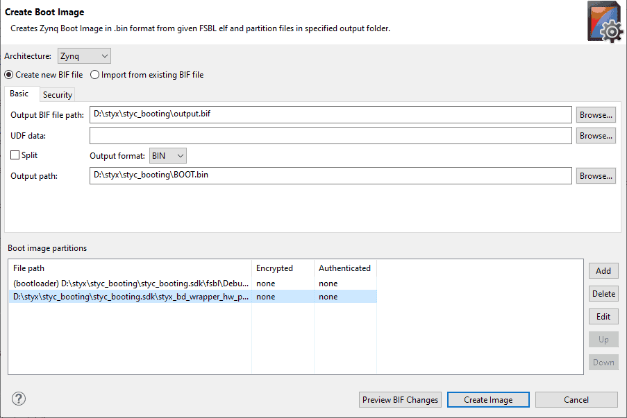 In the create boot image window, provide a path for the Output BIF file and select Output format as BIN. Add the following files manually in boot image partitions,