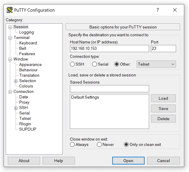 - Open PuTTY, click on other and select TELNET from drop down menu and enter the IP address corresponding to the module, leave the port number as 23.