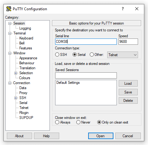 - Open PuTTY, click on serial, input the COM Port number of the module, and click OK.