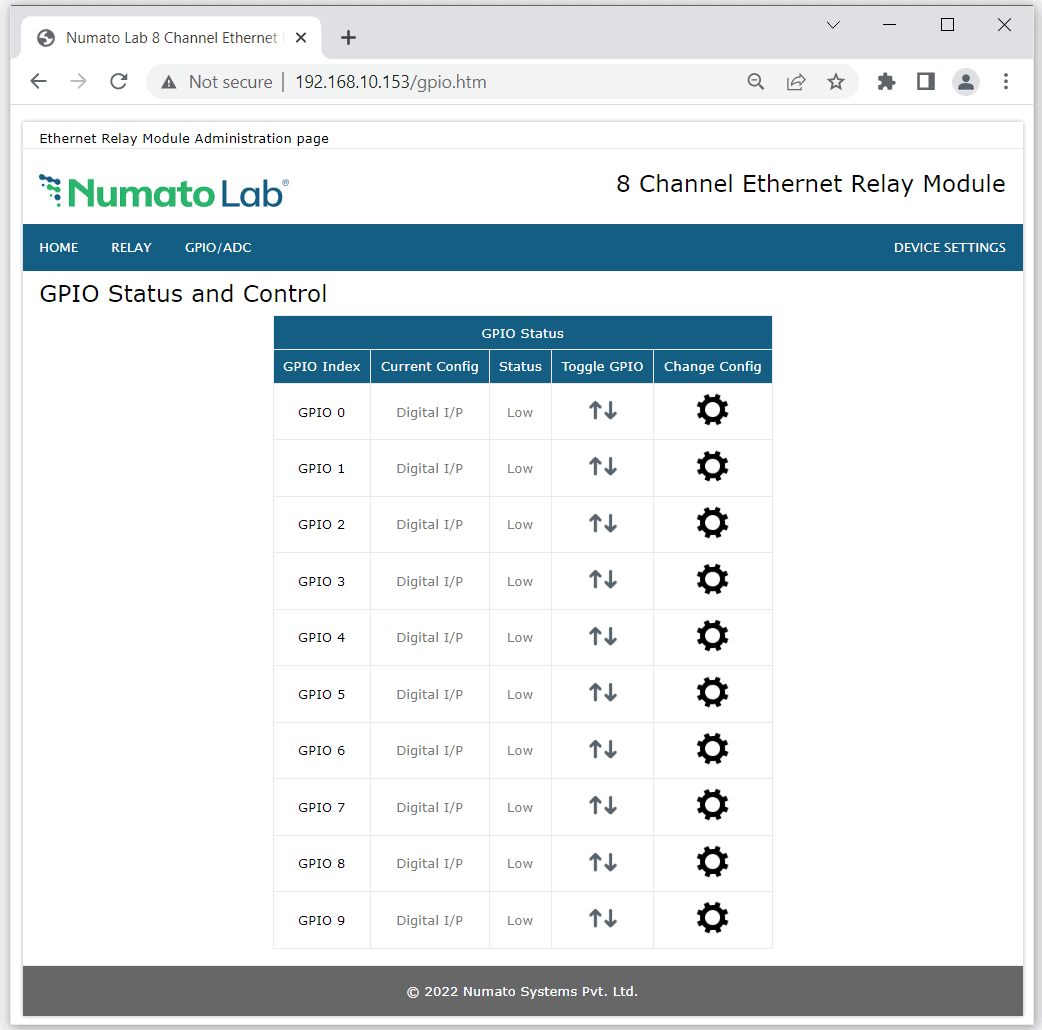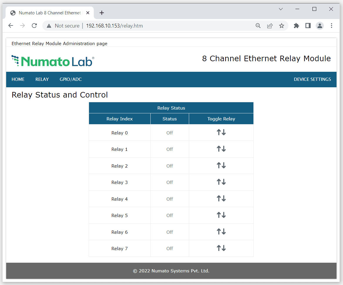 This page will be available only for the Numato Lab Ethernet/PoE Relay modules. Click on ‘Relay’ menu to monitor and control the relays. Relays can be turned ON/OFF with just a click on ‘Toggle Relay’ button for corresponding relays. Relay status is real time and is visible correspondingly.
