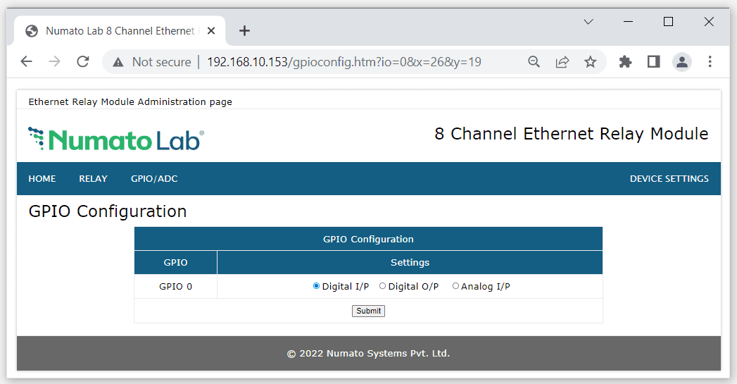 This will be available only for the Numato Lab Ethernet modules. To configure a GPIO as Digital Input, click on corresponding GPIO’s ‘Change Config‘ button. Select “Digital I/P” radio and click the “Submit” button.