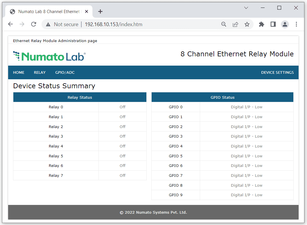 - You will be presented with the device home page that shows the status of Relays and GPIOs according to the module.