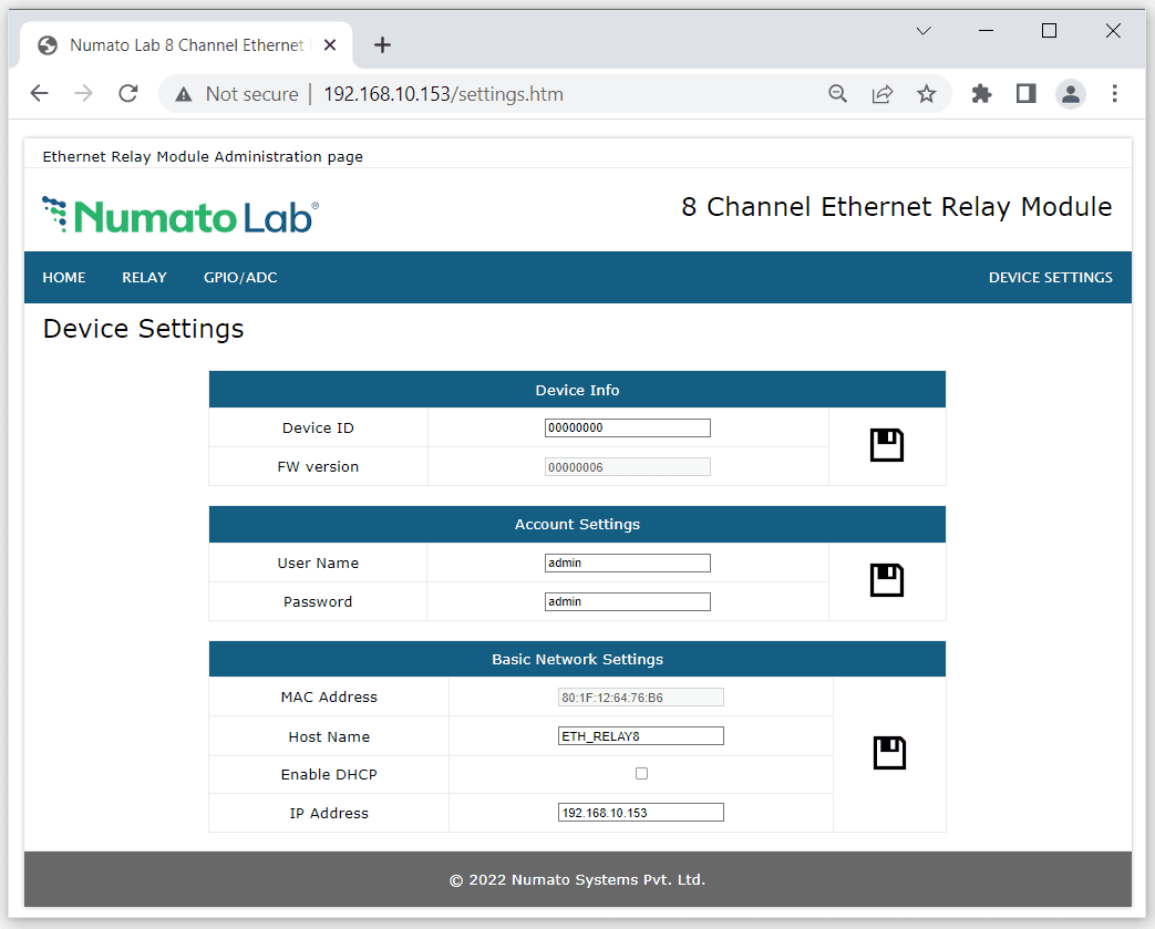 This page displays the current firmware version, device ID, account settings and basic network settings. Click on ‘Device Settings’ menu to access this page. A logged-in user can change and save device ID, username, password, and network settings. After saving changes in network settings, the board will reboot with the new network settings.