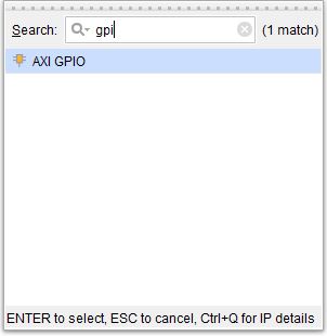 Finally, we will add “AXI GPIO” to the design. Click “Add IP”, type GPIO in the search box and add “AXI GPIO” to the design window.