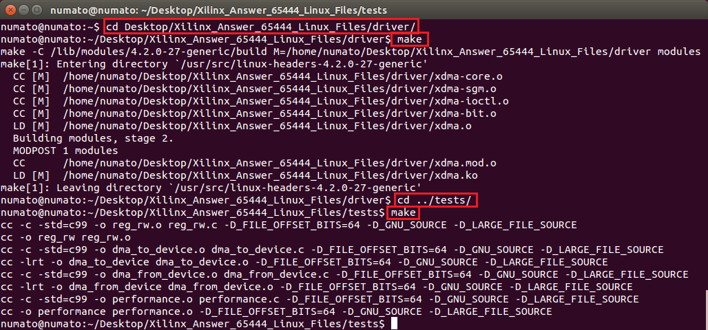 Once the compilation is completed, change the directory to /Xilinx_Answer_65444_Linux_Files/tests/ folder and execute the “make" command to compile the C program in that folder.