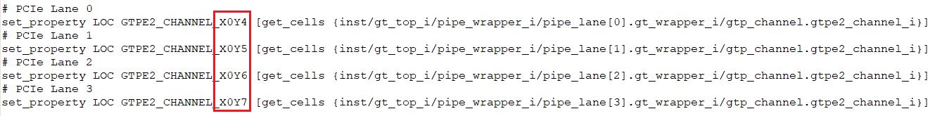 Go to the project folder, and browse to the file pcie_dma_xdma_0_0_pcie2_ip-PCIE_X0Y0 located at the Pcie_dma.gen\sources_1\bd\pcie_dma\ip\pcie_dma_xdma_0_0\ip_0\source folder (the folder names may vary depending on your project and design names). Open it in your favorite text editor and change the following site locations as shown in the image below.