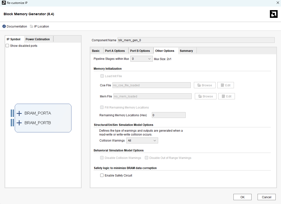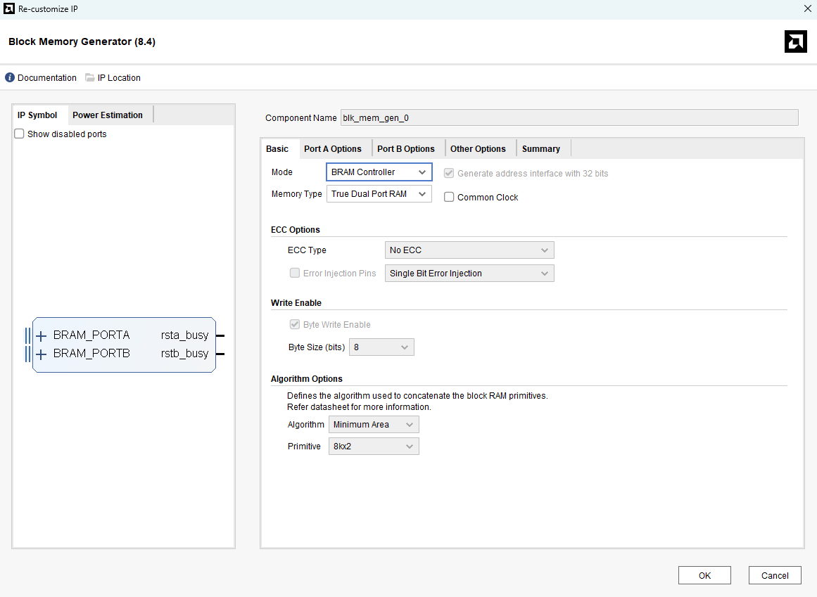 Double-click on “Block Memory Generator” to customize it. In the Basic tab, select the Memory Type as True Dual Port RAM.