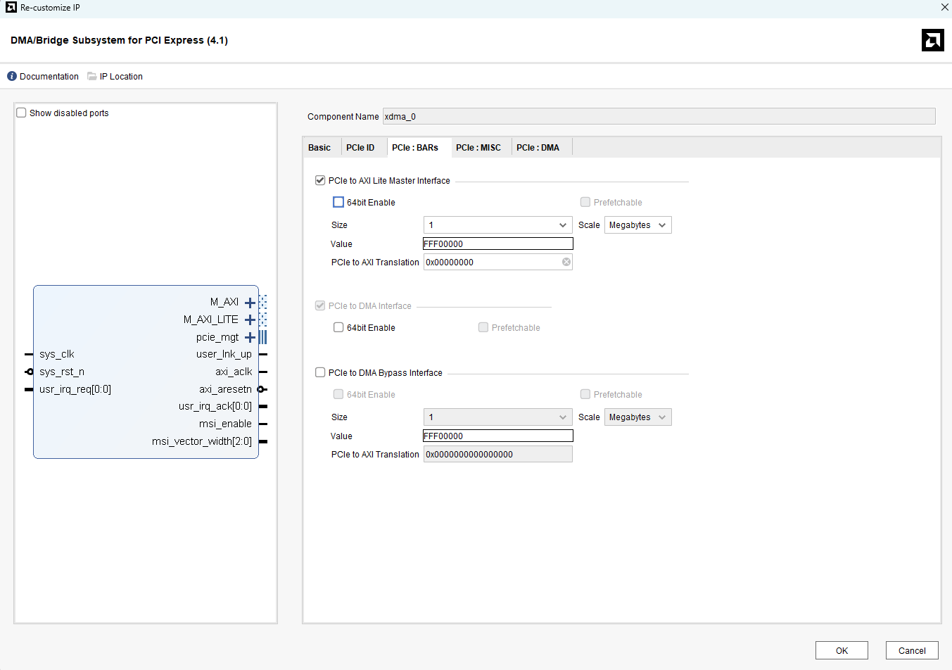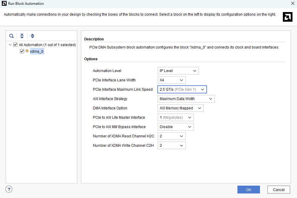 Click “Run Block Automation” and select the “All Automation” checkbox in the window that follows. Under the “Options” tab, select 1 Megabytes for the “PCIe to AXI Lite Master Interface” option. Make sure that the settings are as shown below.