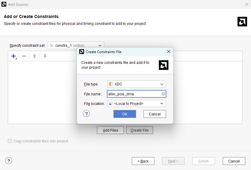 In the window that follows, select “Add or create constraints” and click “Next”. On the following page, select “Create File” and give an appropriate name to the constraints file, as shown below. Click “Finish”.