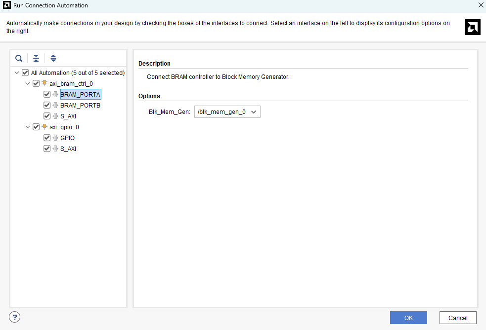 Click “Run Connection Automation”. In the Run Connection Automation window, select the “BRAM_PORTA” interface and change Blk_Mem_Gen under “Options” to /blk_mem_gen_0 as shown in the image below. Repeat the same for “BRAM_PORTB” and click “OK”.