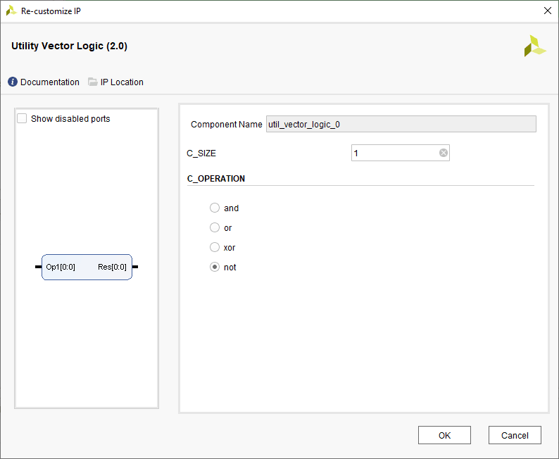 Double-click on the IP to customize it as shown in the image below. Change C_SIZE to 1 and C_OPERATION to “not”. Click “OK” to customize the IP.