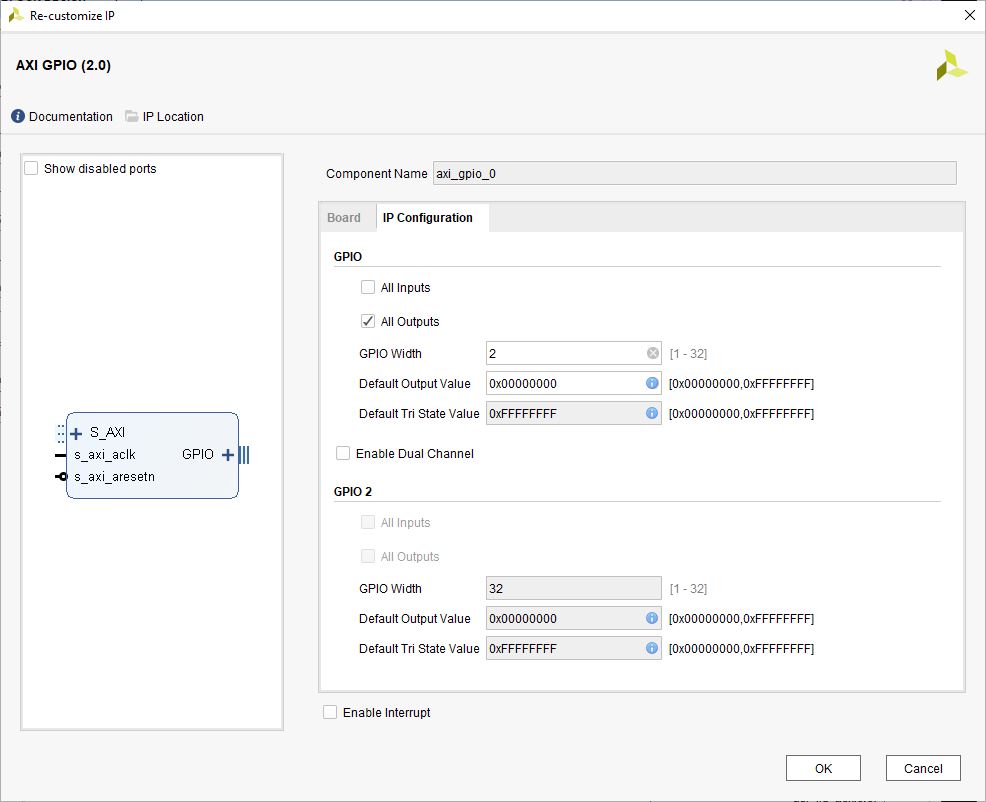 Double-click on the IP and customize it to give a 2-bit output as shown below. In the IP Configuration tab, enable “All Outputs” and change the GPIO Width to 2. We will connect this GPIO port to the red and blue LEDs in Aller.