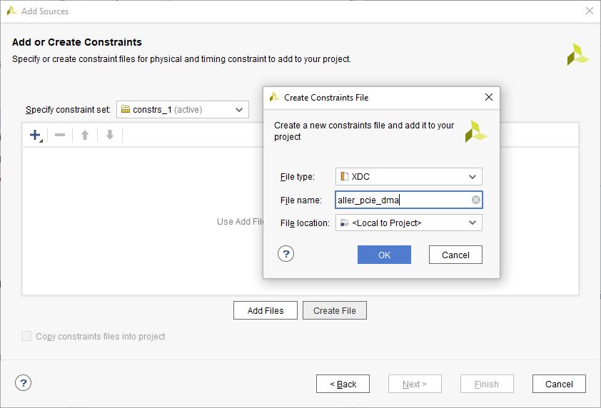 In the window that follows, select “Add or create constraints” and click “Next”. On the following page, select “Create File” and give an appropriate name to the constraints file, as shown below. Click “Finish”.