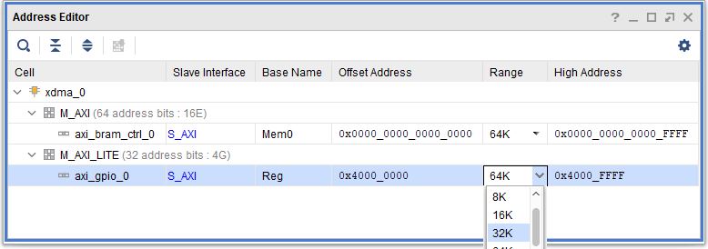 In the “Address Editor” tab, change the Offset Address and Range of axi_bram_ctrl_0 to 0x0000_0000_0000_0000 and 64K respectively. Also, change the Range of axi_gpio_0 to 32K as shown in the following image.