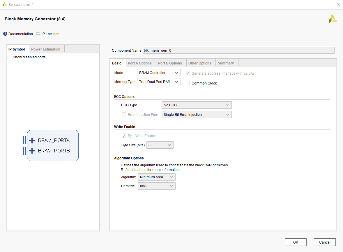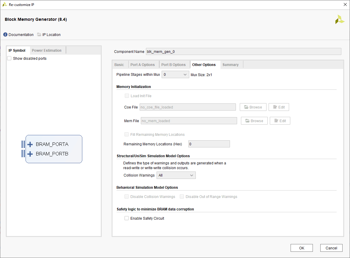 Now, double-click on the “Block Memory Generator” IP to customize it. Under the “Basic” tab, select the Memory Type as “True Dual-Port RAM”. In the “Other Options” tab, disable the “Enable Safety Circuit” option as shown in the images below.