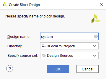 Click “Next” and then “Finish” to create the project. Click “Create Block Diagram” from the IP integrator tab on left, give a name for block design and click OK.