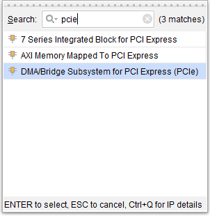 Click “Add IP” from the toolbar as shown in the image below. Type “PCIe” in the search box and double click on “DMA/Bridge Subsystem for PCI Express (PCIe)” to add the IP to the Block Design.