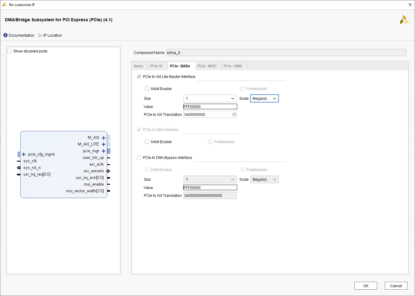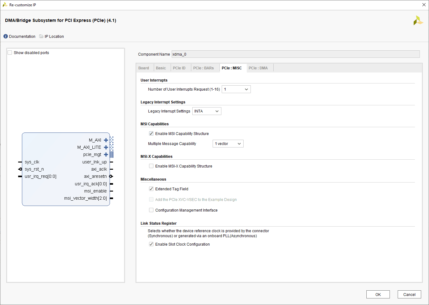 To customize the IP, double-click on the IP. The “Re-customize IP” window should open. In the Basic tab, Select “Lane Width” as “X4”, “Maximum Link Speed” as “5.0 GT/s”. In the “BARs” Tab, enable “PCIe to AXI Lite Master Interface” and set the Size Value as “1 Megabyte”. In the “Misc” tab, disable the “Configuration Management Interface” option and in the “DMA” tab, change the “Number of DMA Read Channel (H2C)” & “Number of DMA Write Channel (C2H)” to 2. Leave the other tabs in their default state and click OK. Refer to the images below for the settings mentioned in this step.