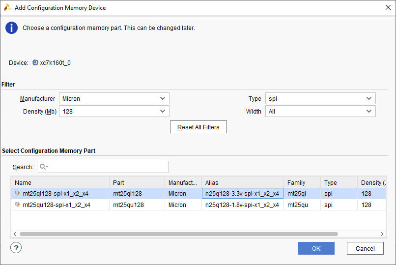 Left-click on the device and select ‘Add Configuration Memory Device…’. It will open a new window. Select Manufacturer as ‘Micron’, Density(Mb) as ‘128’ and Type as ‘spi’. Select device ‘mt25ql 128-spi-x1_x2_x4’ and click on OK.
