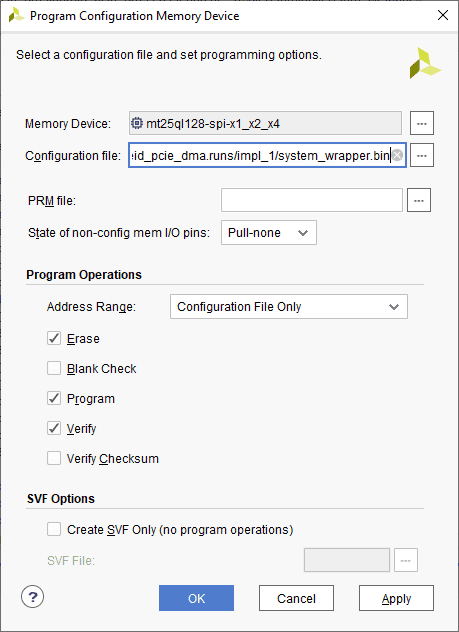 A Dialogue window will appear asking if you want to program the configuration device now. Click Yes and program the .bin bitstream file which is located in “<project location>/ProjectName.runs/impl_1” directory.