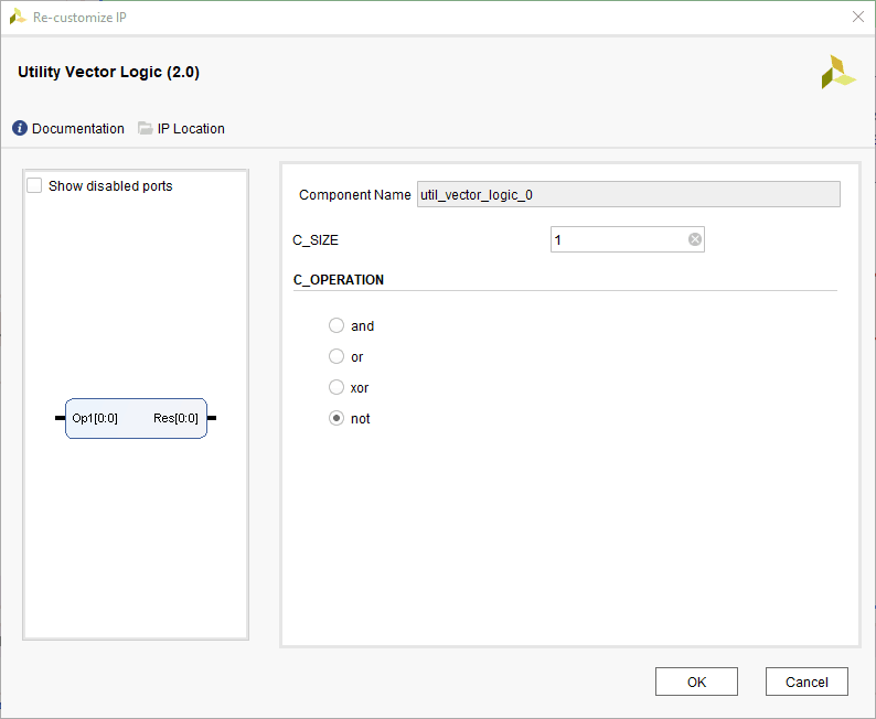 Double click on the IP to customize it. Change the “C_OPERATION” to “not” and change the “C_SIZE” to 1 and click “OK” as shown in the image below.