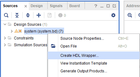 Now, save the block design and right-click on the design in the “Sources” window, select “Create HDL Wrapper” from the popup menu. Click “OK” on the window that appears to finish generating a wrapper.