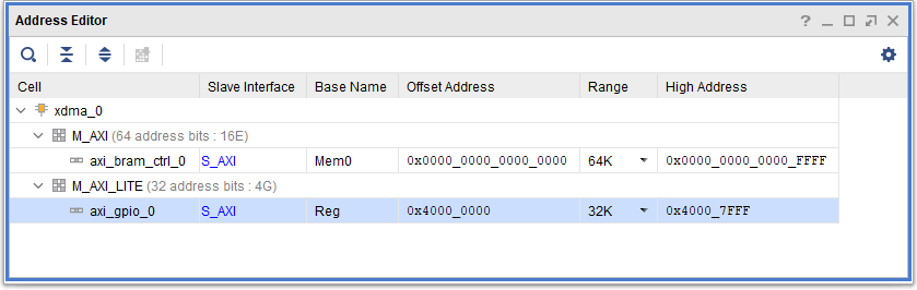 In the “Address Editor” tab, change the Offset Address and Range of axi_bram_ctrl_0 to “0x0000_0000_0000_0000” and “64K” respectively. Also, change the Range of axi_gpio_0 to “32K” as shown in the image below: