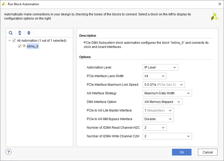 In the Run Block Automation window that appears, settings should be as shown below. Click “OK” for Vivado to automatically configure the blocks for you.