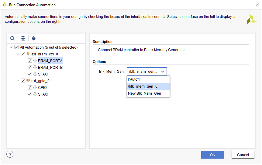 Once Block Automation is complete, run “Connection Automation” so Vivado can connect the blocks to make a complete system. In the Run Connection Automation window that appears, select the “BRAM_PORTA” interface and change the “Blk_Mem_Gen” under options to “/blk_mem_gen_0” as shown in the image below. Repeat the same for “BRAM_PORTB” and click “OK”.