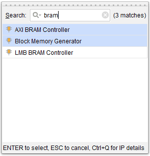 Right-click and select “Add IP”, search for BRAM and add the “AXI BRAM Controller” & “Block Memory Generator” IPs to the design.