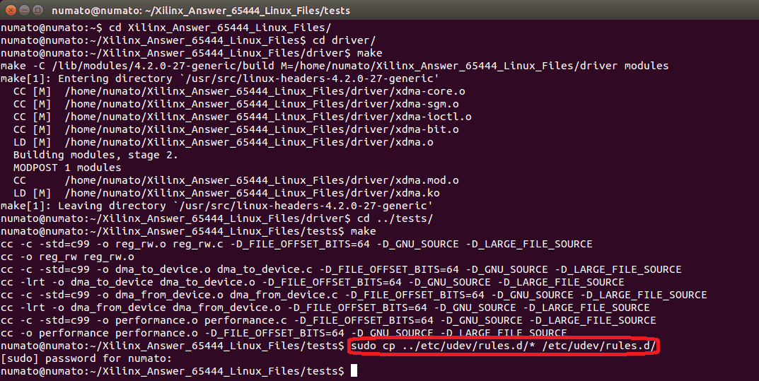 Download the Xilinx Answer 65444 for Linux System from here and save it in a specific location. In the command-line terminal, change the directory to the “Xilinx_Answer_65444_Linux_Files” folder. Enter the /Xilinx_Answer_65444_Linux_Files/driver/ folder by executing the command cd driver/ and compile the C program by executing the command make. Once the compilation is completed, change the directory to the /Xilinx_Answer_65444_Linux_Files/tests/ folder by executing the command cd ../tests/ and execute the make command to compile the C program in the folder.