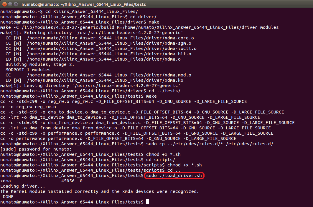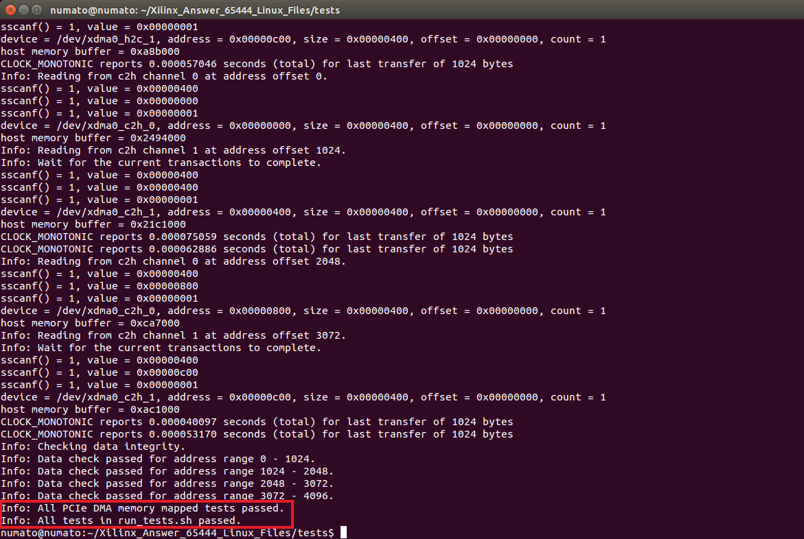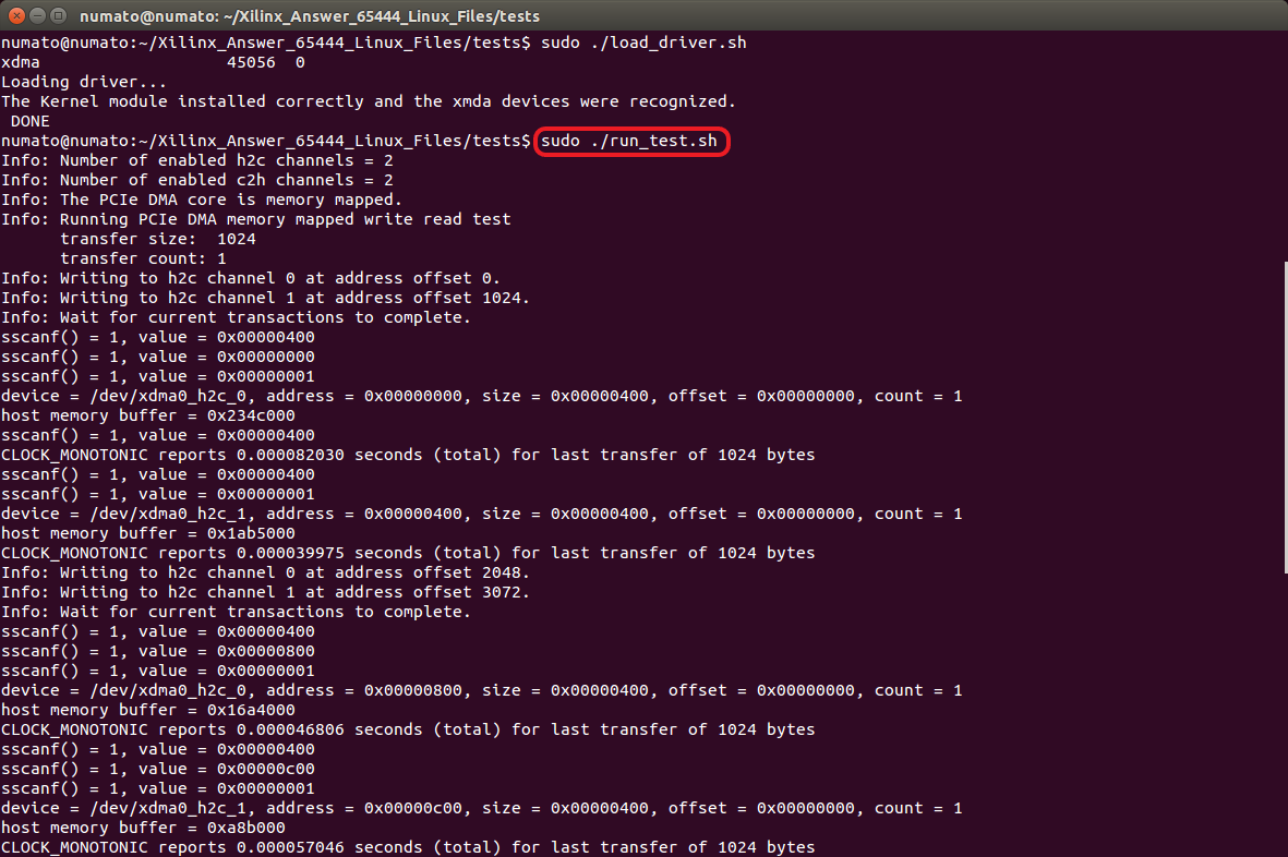Once the driver is loaded, we can run the DMA test by running the shell file “run_test.sh” by executing the command: