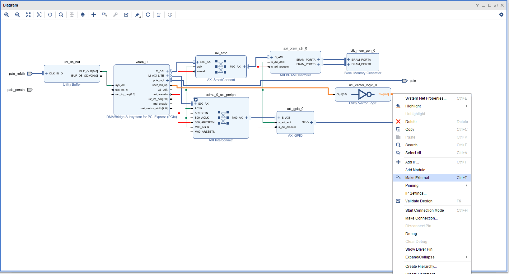 Connect the input of Utility Vector Logic to “user_lnk_up” of “xdma_0” IP and right-click the “Res[0:0]” pin of the Utility Vector Logic IP and select the “Make External” option to make the pin an output signal as shown in the following image. This output port is connected to the Green LED of the board.