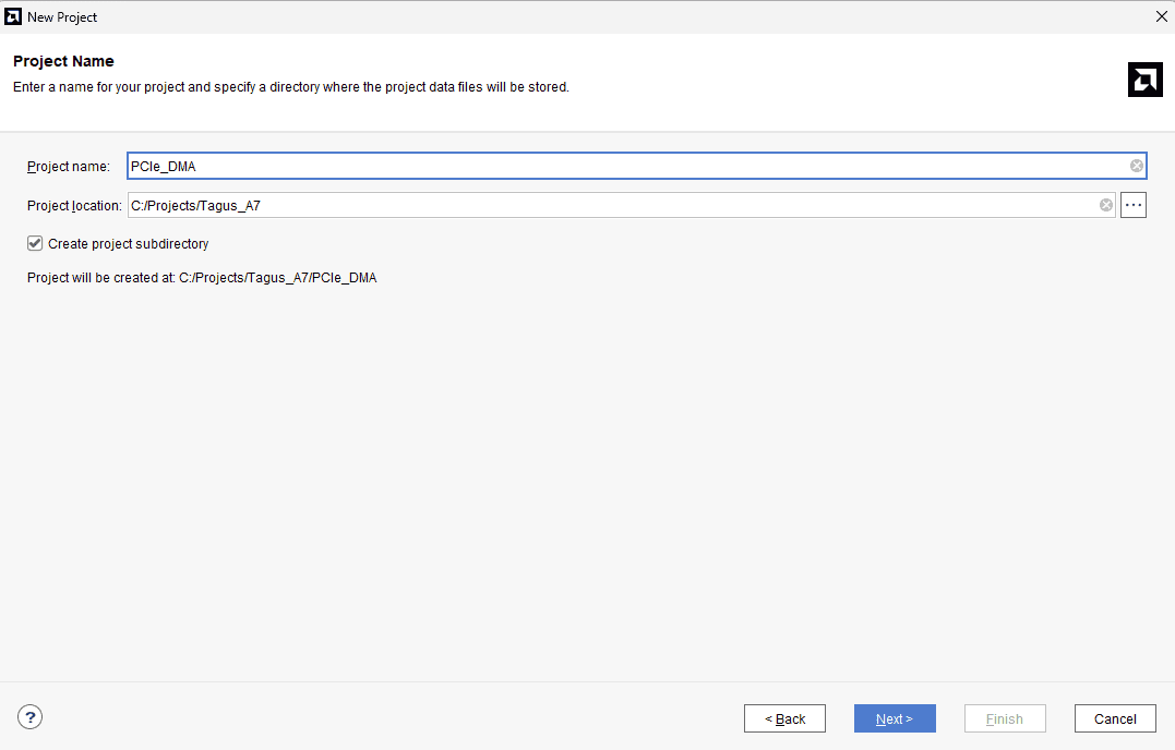 In the “Project Name” wizard, type in a name (for example, “PCIe_DMA“) for the project and save it at a convenient location. Select the checkbox below to keep all project files in a single folder. Click “Next” to proceed.